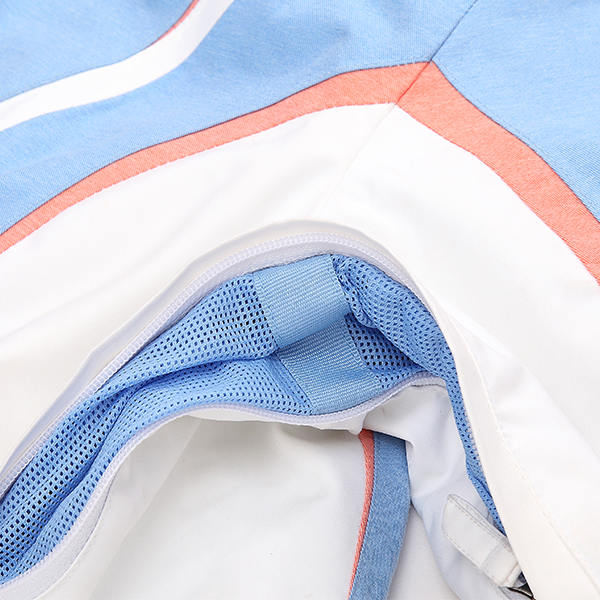 有些沖鋒衣的面料整體如同單層面料,銀灰色為通常的里料顏色,里料連接部位還能看到壓膠條。另外一種沖鋒衣是由獨立的兩個分層材料縫制而成,外表層面料是通過把具有防水功能且透氣性良好材料制成有特殊保護的織物組織結(jié)構(gòu)。此類外表面料的外層起防水透氣作用,內(nèi)層主要起排汗作用。里料層是另一層獨立的織物,里料和面料是可分開的,里料色彩一般為暗色,主要由錦綸材料、棉纖維之類吸汗材料制成,結(jié)構(gòu)主要以網(wǎng)格為主,面料的拼合部位的壓膠通常會被里料遮蓋住,只有網(wǎng)格結(jié)構(gòu)的里料才能看到壓膠處。